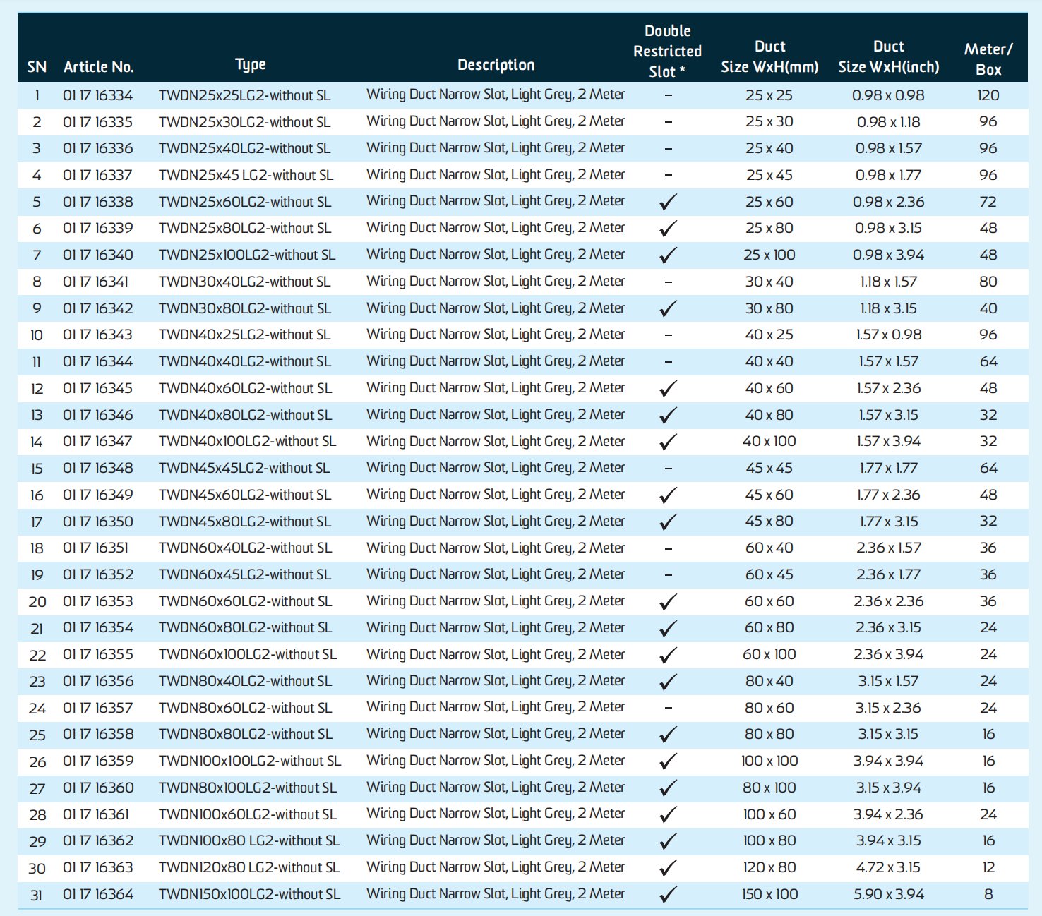 As per Attached PDF AS PER ATTACHED PDF WIRING DUCT TWDN VARIOUS SIZES WITHOUT SL